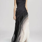 This beautiful gown boasts a flattering form-fitting top and a gracefully flowing asymmetrical layered skirt, crafted from lightweight and sheer fabric for elegant motion. Perfect for formal events and special gatherings, this stylish dress provides a chic and sophisticated appearance.