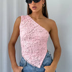 This asymmetrical lace top brings elegance and allure to any ensemble. The single-shoulder design along with delicate lace offers a feminine and striking appearance. The understated elements make this top ideal for outings or special events.