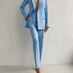 Check out the Marva blazer and pants set – a chic women's suit, offered in fashionable colors: light blue, black, pink, and turquoise. The contemporary blazer and coordinating pants have a flattering design and are expertly crafted from stretchy fabric, ensuring comfort throughout the day. This classic set is ideal for work, meetings, and special occasions and can be easily matched with both formal and casual attire.