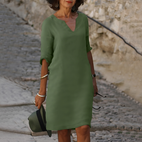 The Precilla stylish summer dress for women blends contemporary fashion with day-long comfort. Featuring a relaxed fit and a flattering V-neckline, this women's mid-length straight dress accentuates your natural shape and allows for easy movement. Crafted from a soft and breathable fabric, it keeps you cool and comfy while enjoying your warm-weather outings. Perfect for casual days, brunches, getaways, or summer parties, this adaptable dress looks great with sandals, heels, or flats. An essential piece in the wardrobe of sophisticated women.